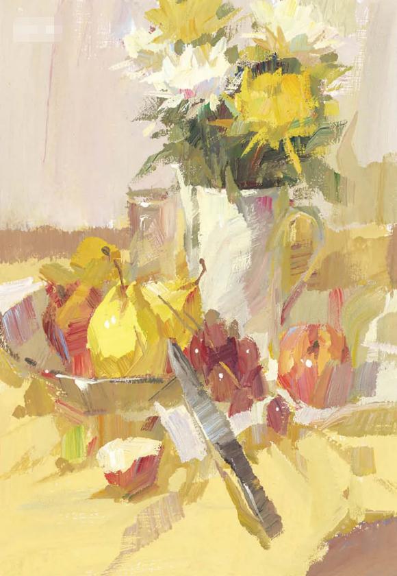 ②以花卉为主题的作画,其氛围营造较容易掌握,在表现时应该注意其空间感的展现,花束的空间展现,其球体意识的把握,花朵的主次区分,花朵、花瓣与枝叶间的协调关系等,学会使用松散、灵活的笔触来美化、完善画面。