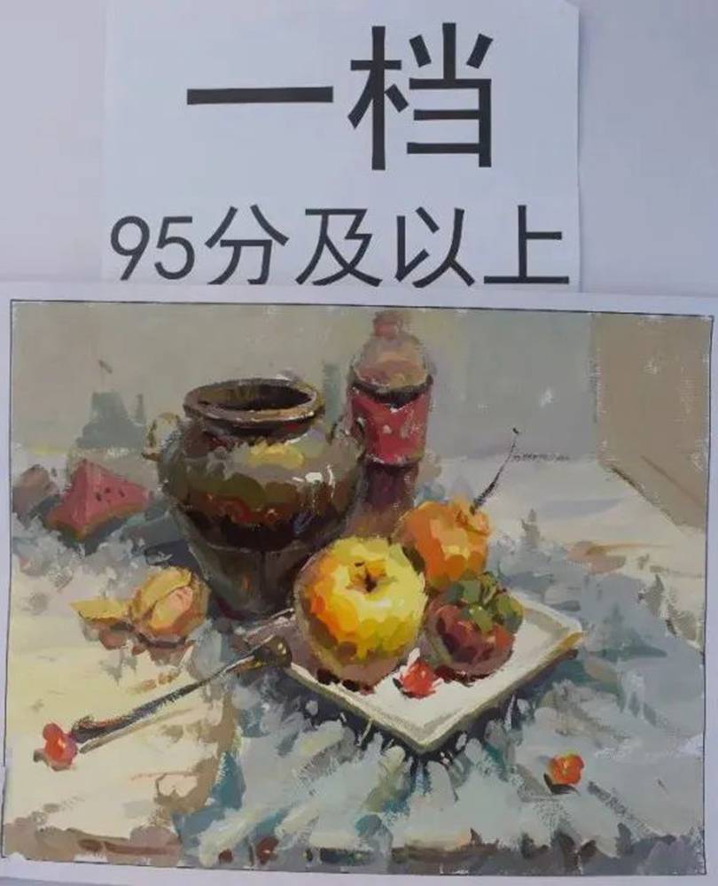第一档(95及以上):符合题目要求,构图完整、合理,且有较强的形式美感。色彩关系准确生动,色调鲜明。色彩与形体结合好,塑造深入,并能充分体现不同物体的质感和造型特征,画面具有一定的艺术表现力。